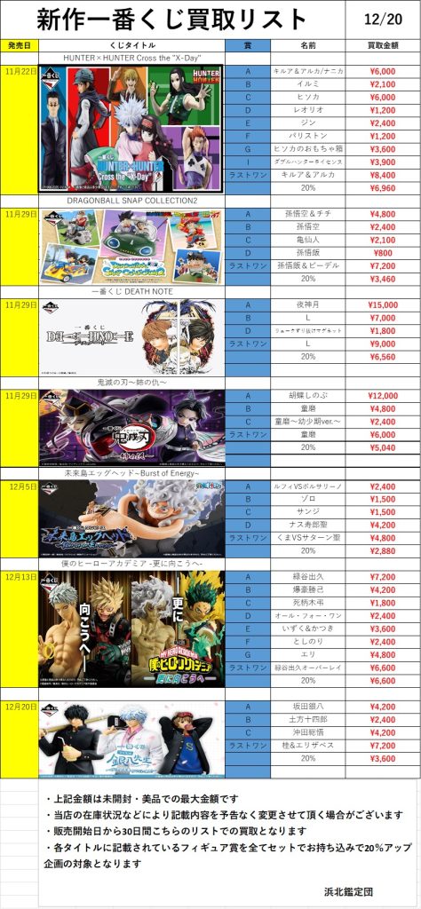 新作一番くじ買取リスト更新しました!12/20