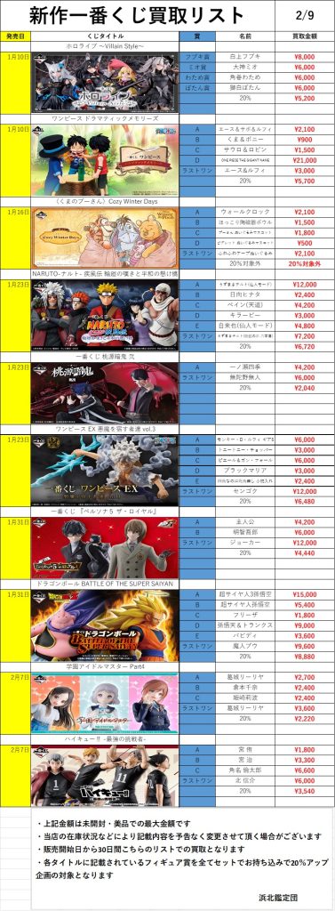 浜北鑑定団玩具部門です! 新作一番くじ買取リスト更新しました! こちらのリストに載っているフィギュア賞を全てセットでお持ち込み頂くと、そのタイトルごとの合計買… -