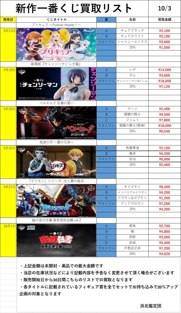 浜北鑑定団玩具部門です! 新作一番くじ買取リスト更新しました! こちらのリストに載っているフィギュア賞を全てセットでお持ち込み頂くと、そのタイトルごとの合計買取金額+20%UP企画も実施中! さらにフィギュア5点お持ち込みごとに+1000円の企画もご...