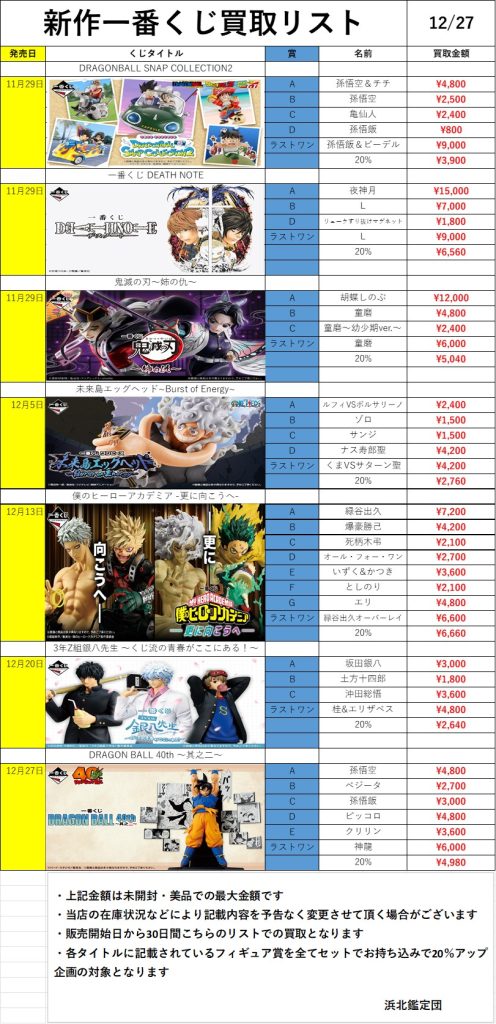 浜北鑑定団玩具部門です! 新作一番くじ買取リスト更新しました! こちらのリストに載っているフィギュア賞を全てセットでお持ち込み頂くと、そのタイトルごとの合計買取金額+20%UP企画も実施中! さらにフィギュア5点お持ち込みごとに+1000円の企画もご... -