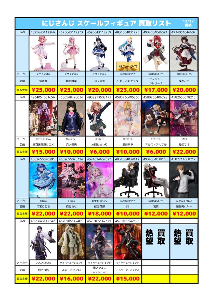 今回のリスト(12/7更新)はVTuberフィギュアの相場として非常に参考になる内容です。
