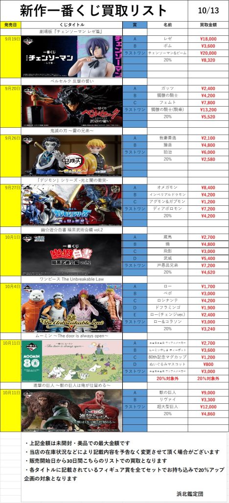 浜北鑑定団玩具部門です! 新作一番くじ買取リスト更新しました! こちらのリストに載っているフィギュア賞を全てセットでお持ち込み頂くと、そのタイトルごとの合計買取金額+20%UP企画も実施中! さらにフィギュア5点お持ち込みごとに+1000円の企画もご... -