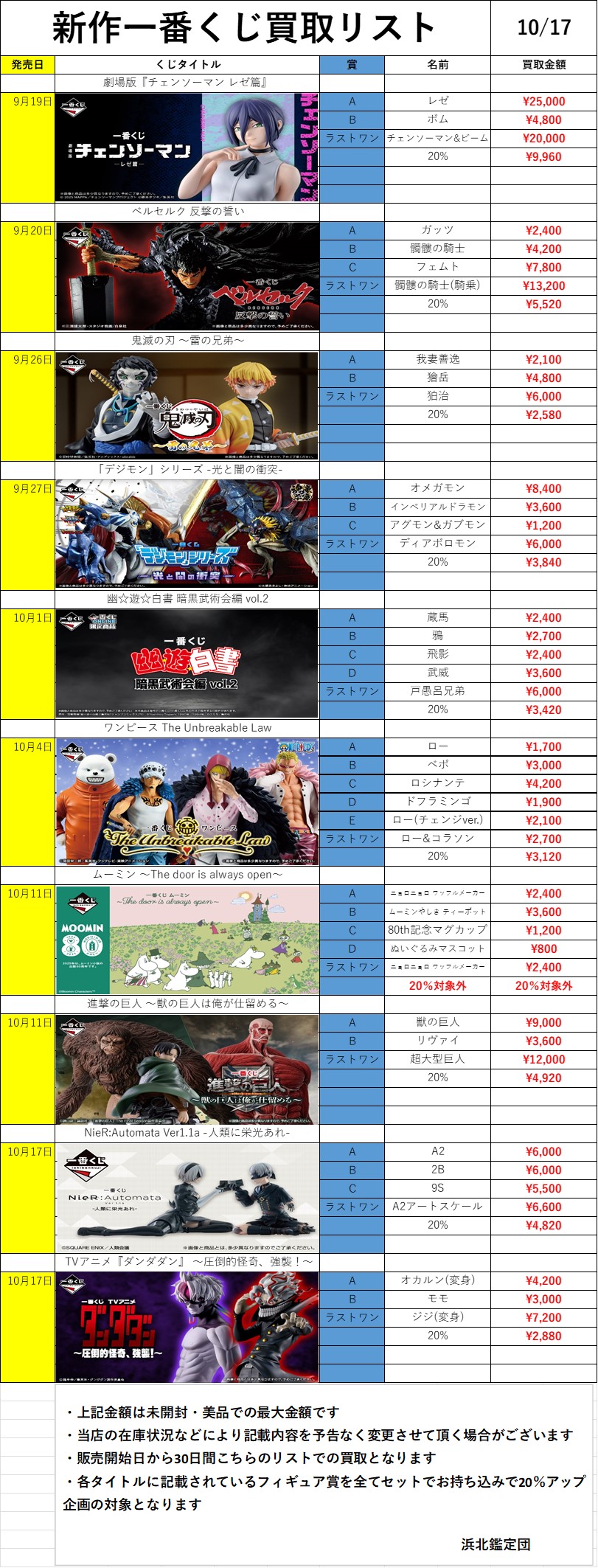 少年漫画系一番(タイトー)くじ買取リスト | 8月2日 | |||
