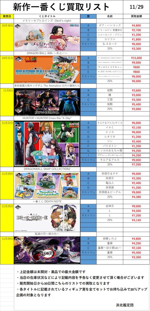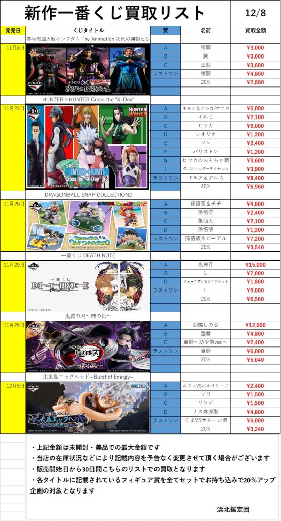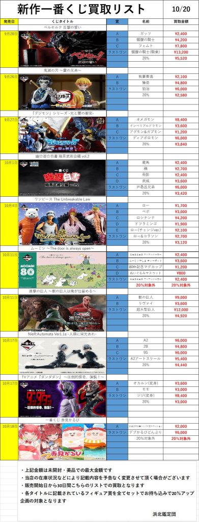 ※上記買取金額は当店の在庫状況などにより予告なく変更させて頂く場合がございます。また下記金額は内袋未開封・完品・美品での最大金額となります。