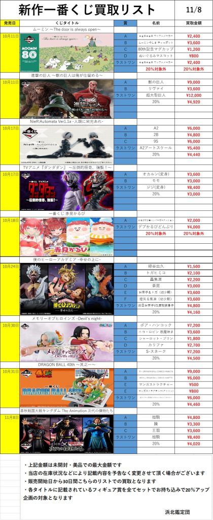 | 商品コード | 商品名称 | 作品タイトル | 買取単価 |